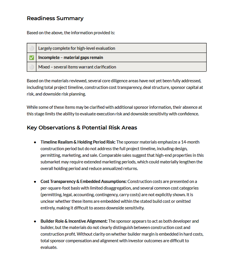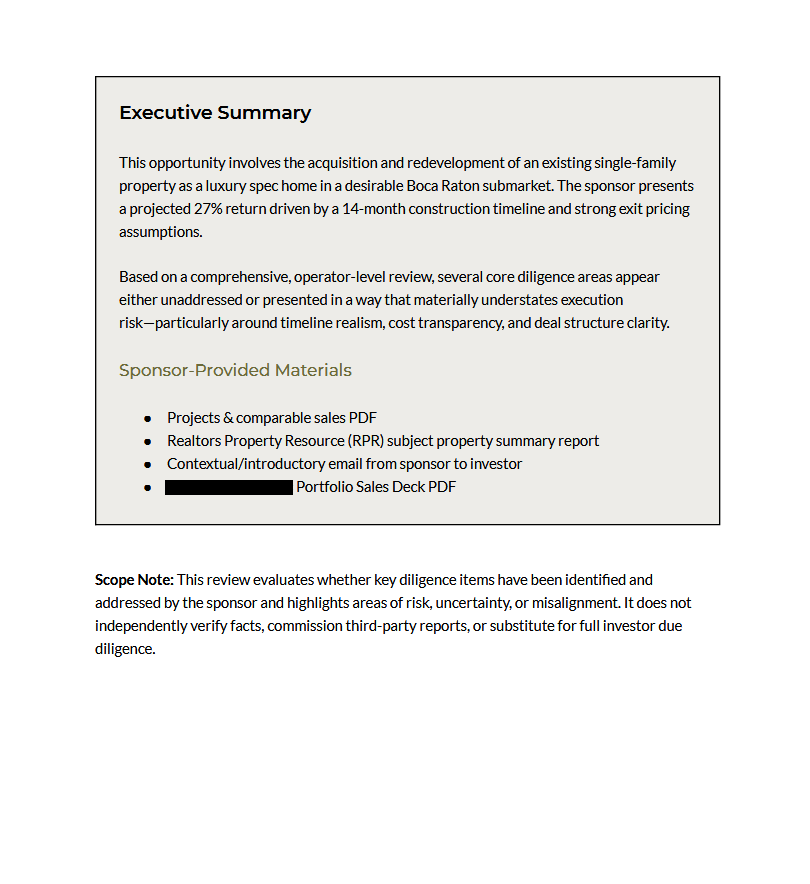 Independent, structured review of a residential development or spec-home deal, designed to surface execution risk, material blind spots, and decision-critical issues before capital is committed.