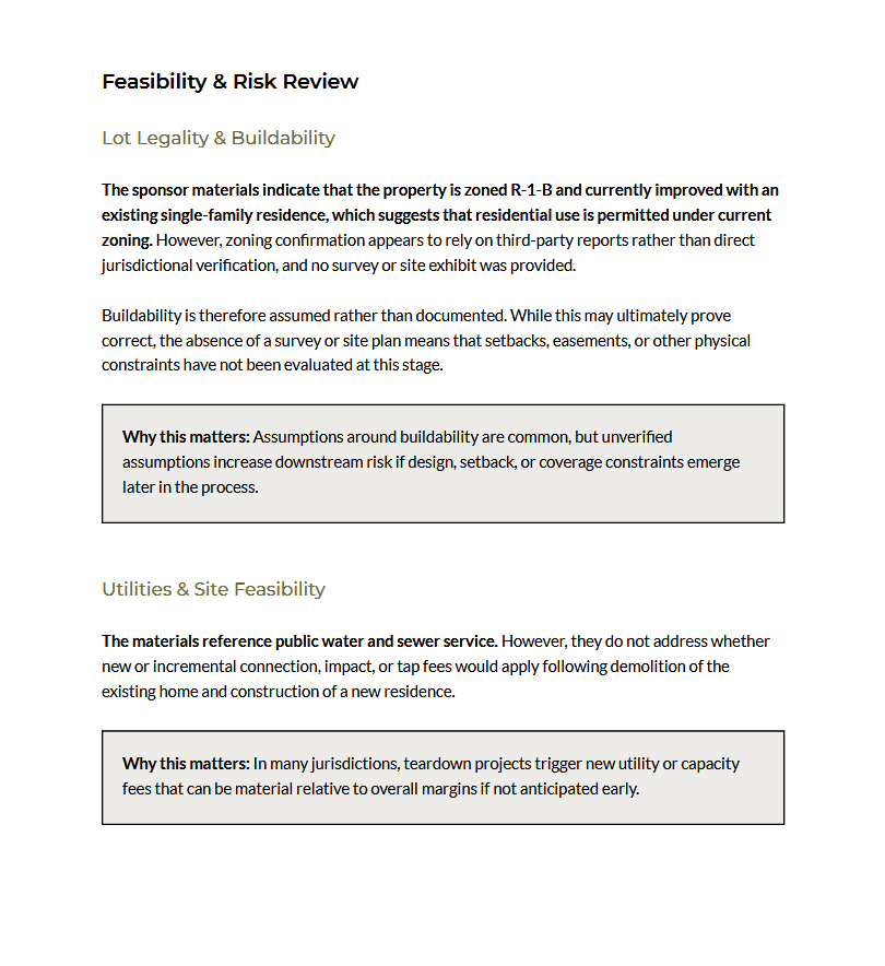 • Projects involving multiple lots, phased development, or heightened downside risk require an expanded review scope. Multi-lot or subdivision projects are subject to an additional scope adjustment, which is presented clearly at checkout. Structured scenario analysis is optional and available for deals where additional downside stress-testing is appropriate.